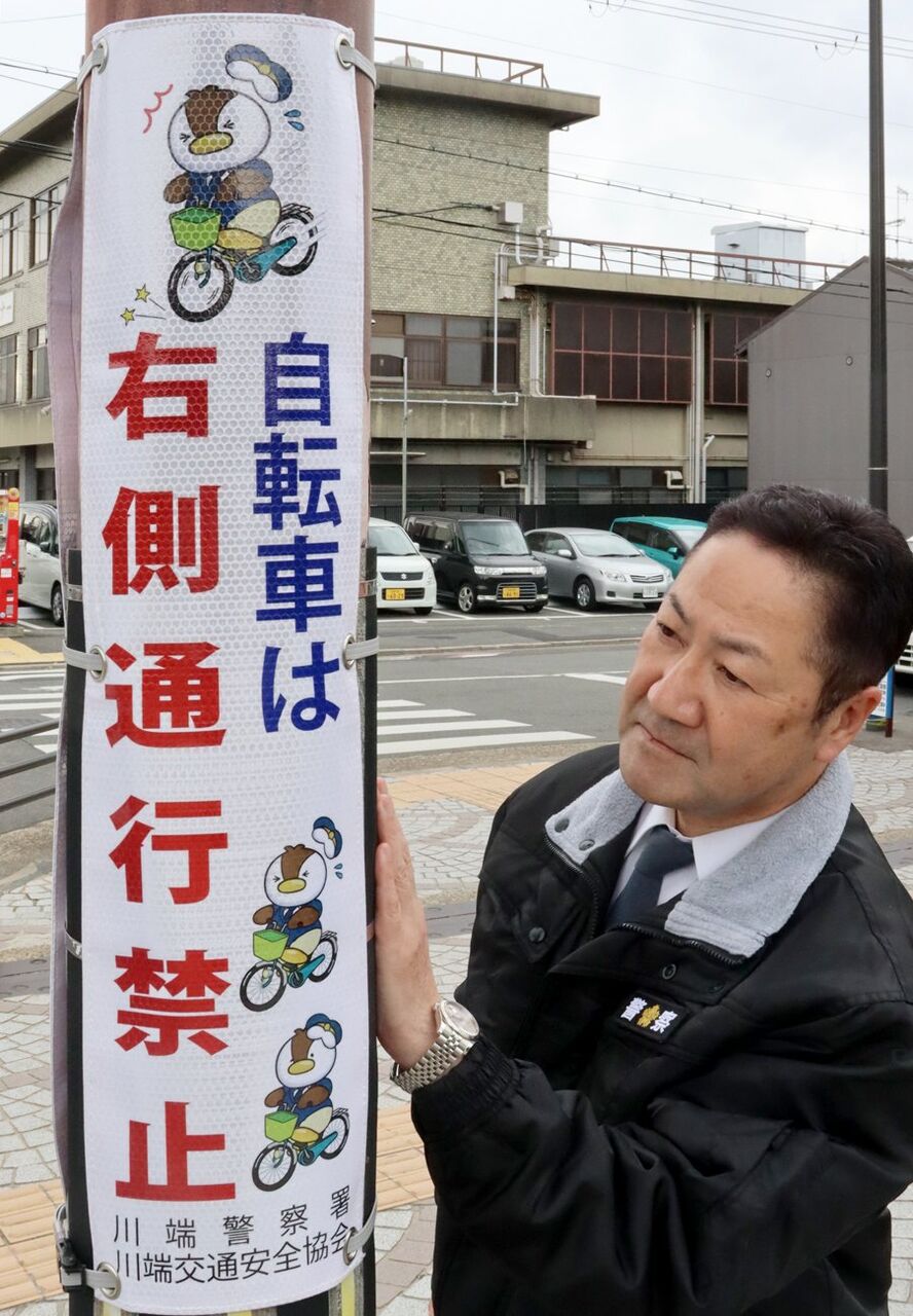 電柱幕は縦80センチ、横20センチで、同署と川端交通安全協会が作った。自転車は道交法で原則左側を走ることが定められているが、右側を走行中の事故が多いことから企画した。