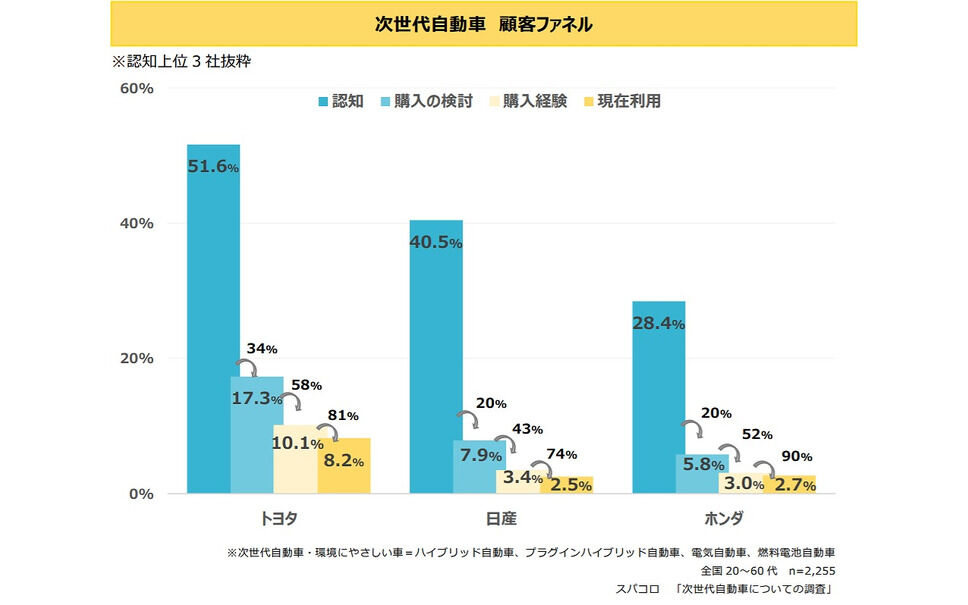 各社の次世代車の認知・利用状況では、トヨタの場合、認知51.6%、購入の検討17.3%、購入経験10.1%、現在利用8.2%。日産で認知40.5%、購入の検討7.9%、購入経験3.4%、現在利用2.5%。ホンダで認知28.4%、購入の検討5.8%、購入経験3.0%、現在利用2.7%。トヨタが4項目すべてで1位となった。認知者のうち2・3割が購入の検討に残り、そのうち約半分が実際に購入に至るというフローの中で、認知・購入の検討にて高い数字を誇るトヨタが市場優位を保っていることがわかる。