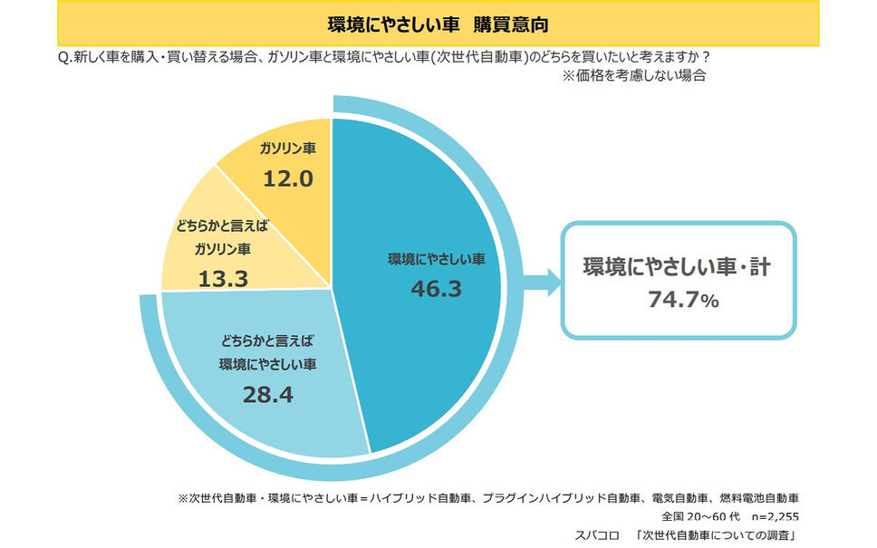 次に価格を考慮しない前提で、「購入・買い替えの場合、環境にやさしい車(次世代自動車)とガソリン車のどちらを買いたいか」と尋ねたところ、「環境にやさしい車」(46.3%)と「どちらかと言えば環境にやさしい車」(28.4%)の合計は74.7%。これに対し「ガソリン車」(12.0%)と「どちらかと言えばガソリン車」(13.3%)の合計は25.3%。価格を気にしなくてよいならば4人に3人は「環境にやさしい車」を買いたいと考えているようだ。