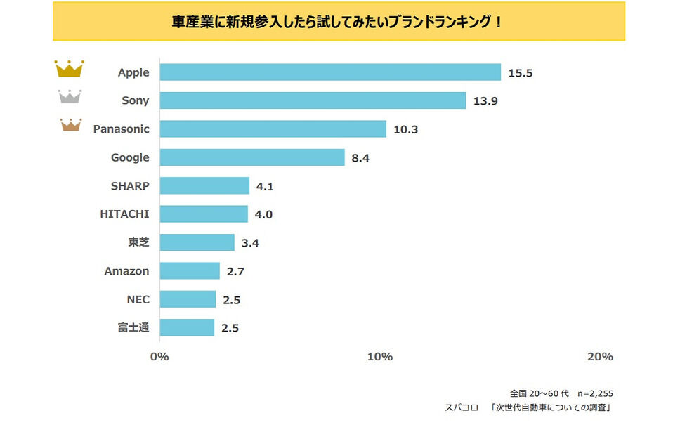 近い将来、AppleやGoogle、Sonyが自動車産業に参入するのではないかと言われているが、最後に新規参入したら乗りたいブランドを調査したところ、上位から「アップル」(15.5%)、「ソニー」(13.9%)、「パナソニック」(10.3%)、「Google」(8.4%)、「シャープ」(4.1%)という結果となった。選択理由として、各ブランドともに、既存の自動車メーカーにない自動車を開発してくれるのではないかという期待を寄せるコメントが多く寄せられている。