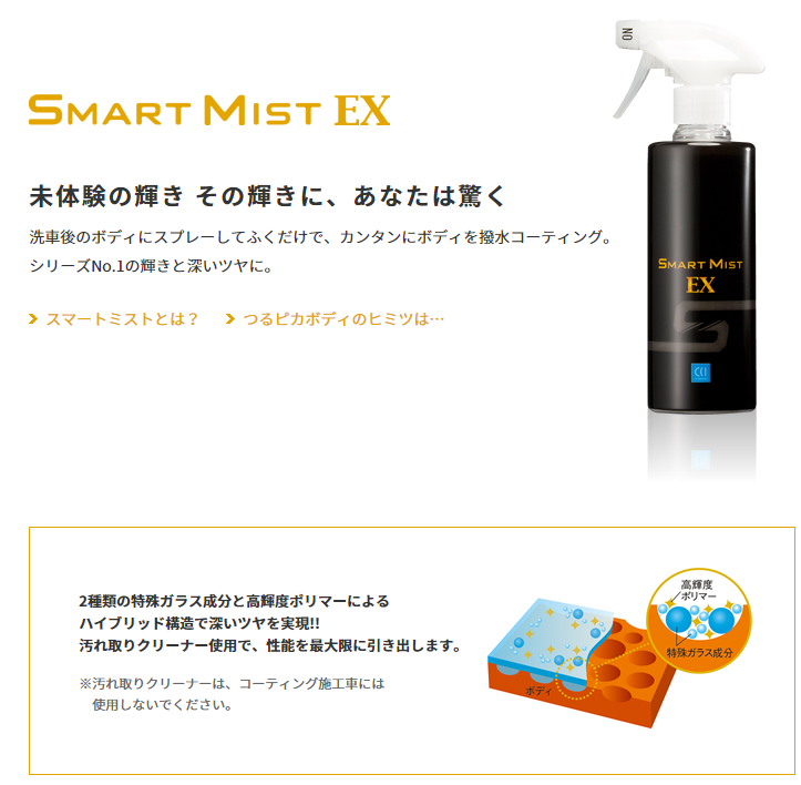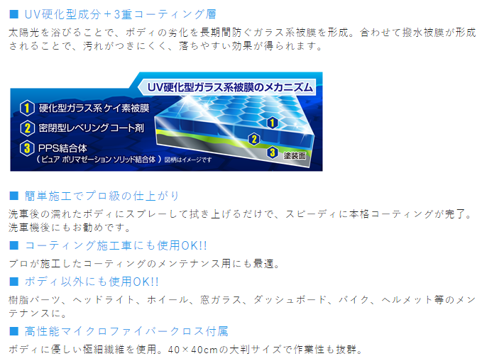 これは、洗車後にスプレーして拭き取ることで、強固な塗膜を形成し、ボディにツヤを出すことができる。また、汚れがつきにくく洗車回数も減る。