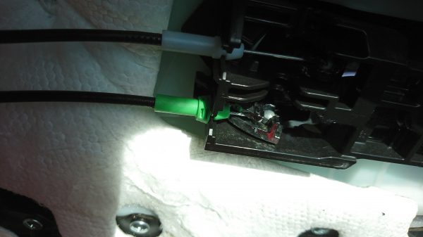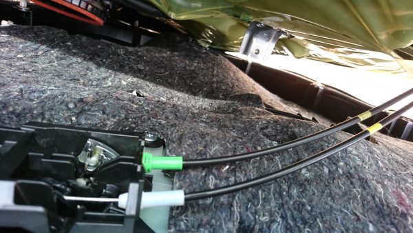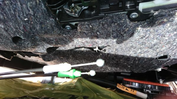 内張りの裏側にドアノブのケーブルがありますので、それをとる。